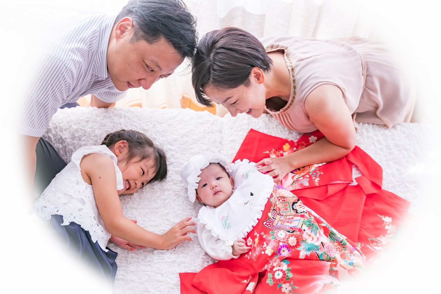 お宮参りというご家族の大切な記念日を、お仕度から、皆様お揃いの笑顔のご会食まで、その日を辿れるご撮影をします。その時ならではのお子様の姿と皆様お揃いの笑顔を、自然光を活かしナチュラルなお写真に残します。1枚1枚色調を整え150カット以上を後日データ納品いたします。